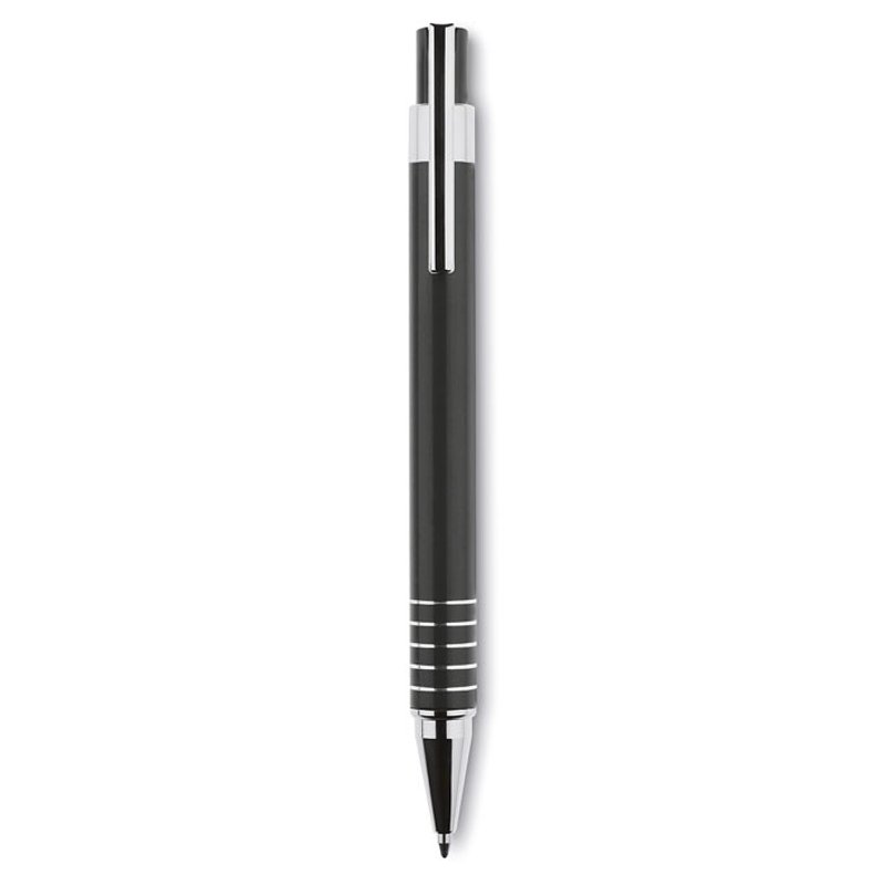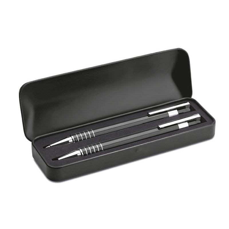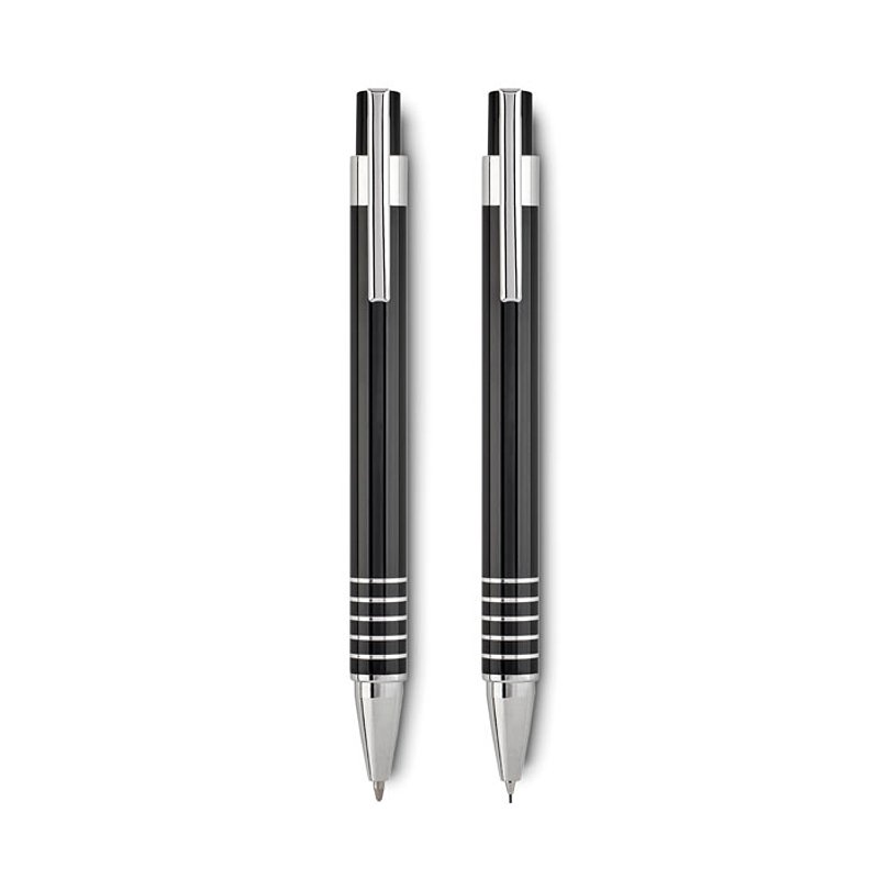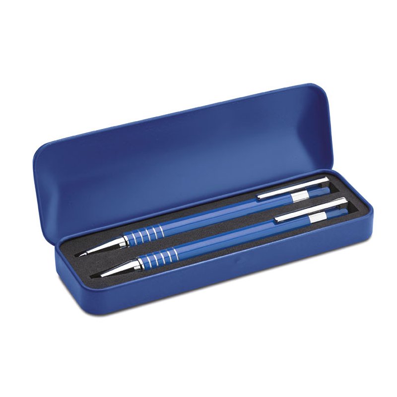 Set de bolígrafo y portaminas de aluminio. Bolígrafo automático con tinta azul. Presentado en una caja de metal a conjunto.