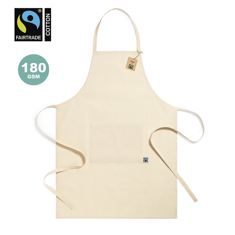Delantal de línea nature, fabricado en 100% algodón de 180g/m2 en tono natural. Con certificación Fairtrade (Comercio Justo) un sistema comercial solidario y alternativo al convencional que persigue el desarrollo de los pueblos y la lucha contra la pobreza. Con bolsillo frontal y cintas de ajuste, de corte por debajo de la rodilla. Incluida etiqueta Fairtrade y hangtag distintivo en cartón reciclado.