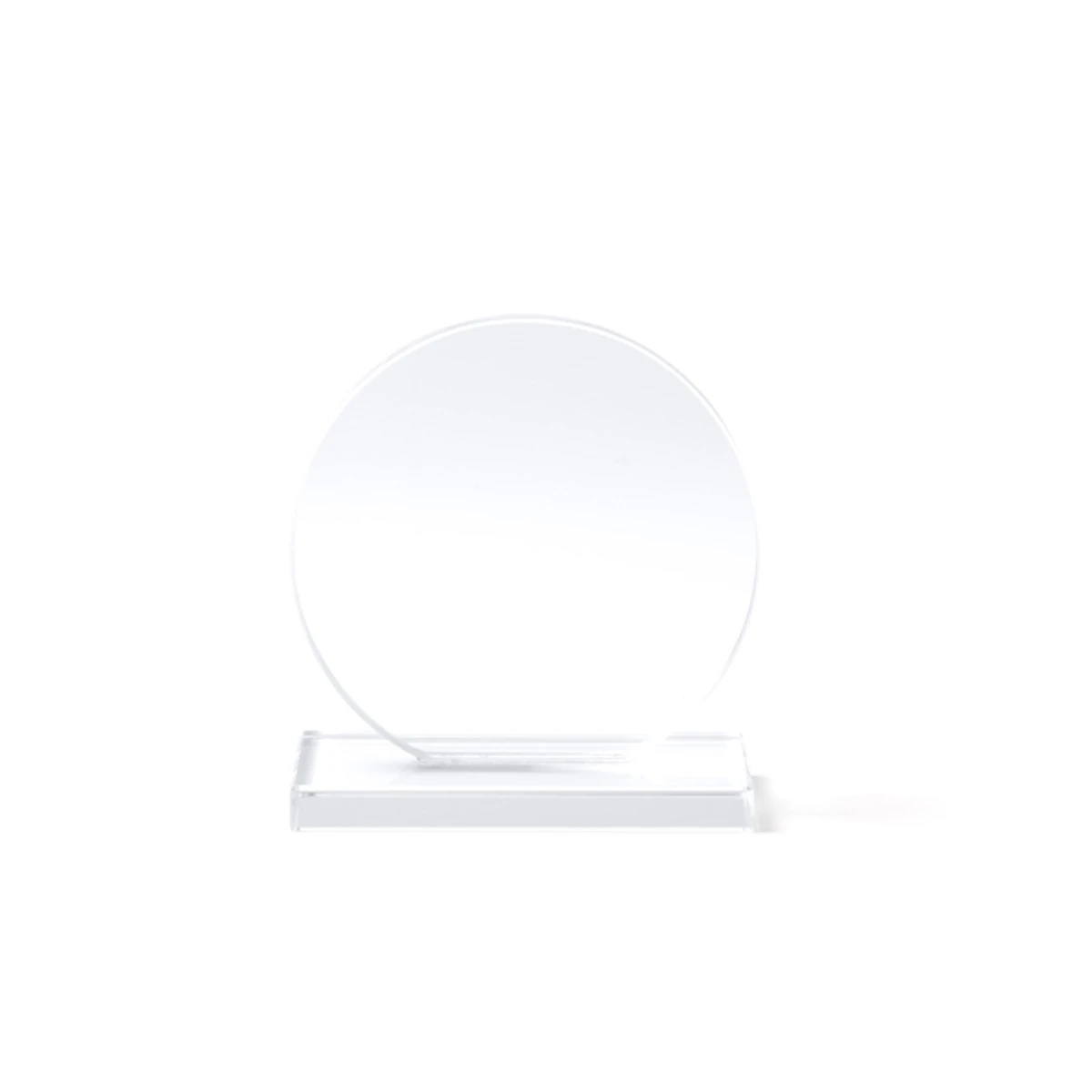Trofeo de cristal de diseño circular con base rectangular. Incluye estuche de presentación con base acolchada en color negro.