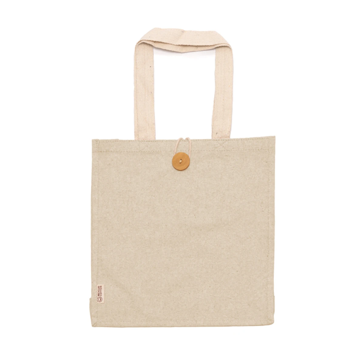 Bolsa de algodón reciclado 300g/m² con acabado jaspeado. Asas largas reforzadas de 70 cm. Cierre con botón.