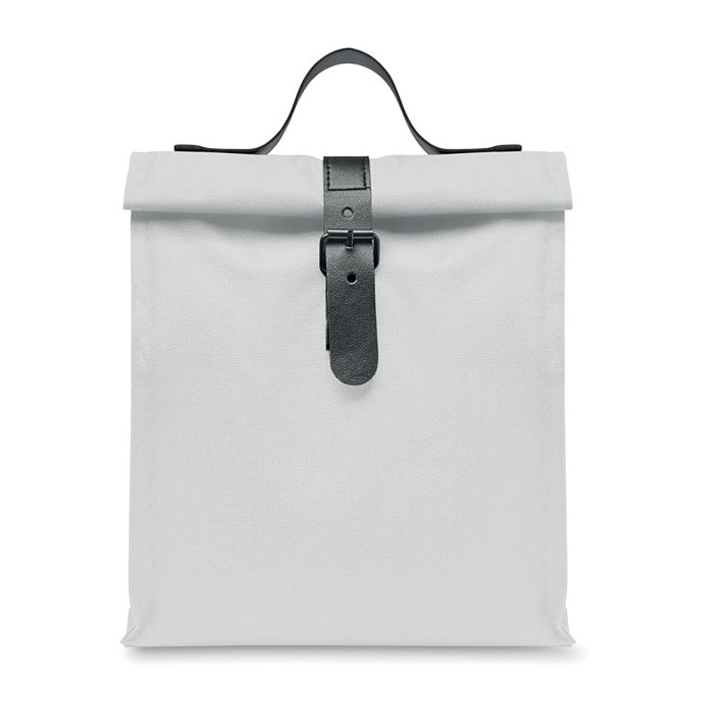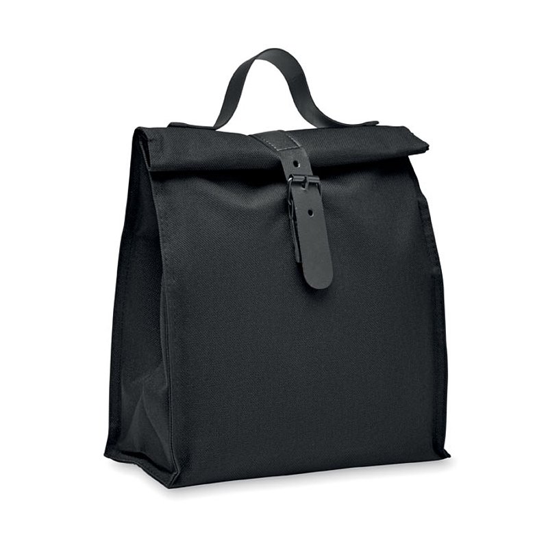 Bolsa nevera rolltop aislante de poliéster RPET 600D con asa y cierre de PU. Aislamiento: espuma PE de 3 mm con PEVA.
