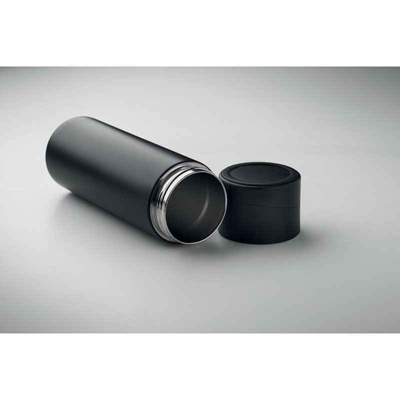 Botella de doble pared aislada al vacío de acero inoxidable reciclado (90% de acero inoxidable reciclado y 10% de acero inoxidable) con tapa de silicona antideslizante con anillo portateléfono. Capacidad: 420 ml.
