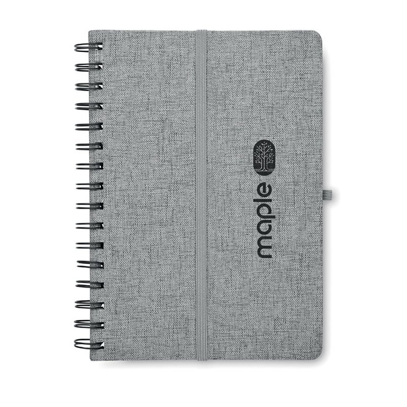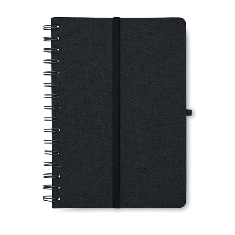 Libreta A5 de anillas con tapa dura de RPET 600D con función de soporte para smartphone. Doble hilo. 160 páginas rayadas (80 hojas). papel reciclado de 70 g/m². Banda elástica de cierre.