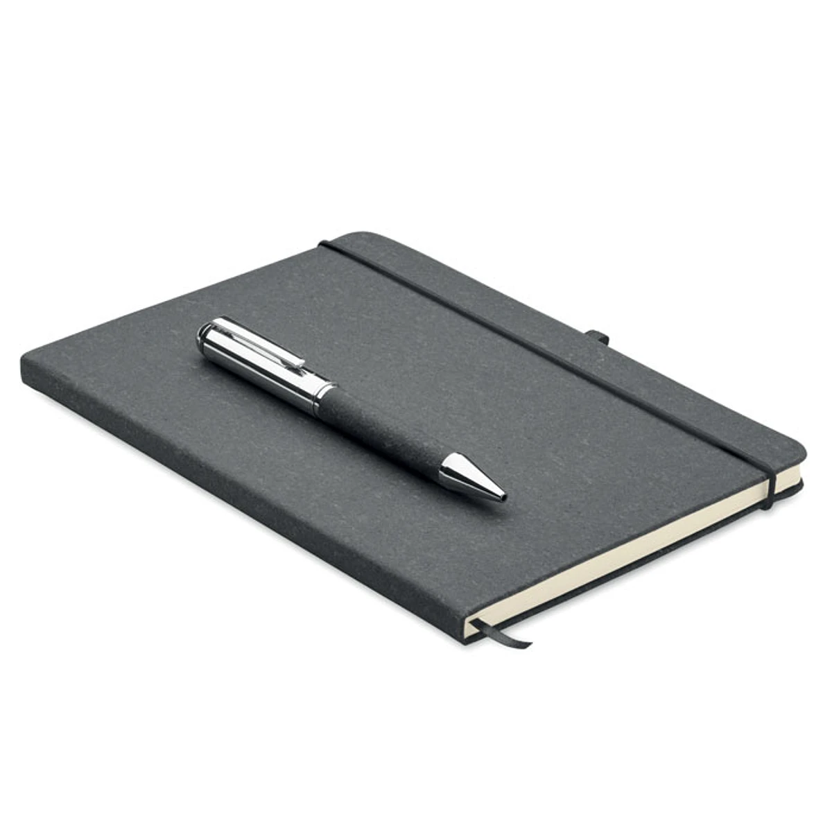 ELEGANOTESet de regalo. Libreta A5 de piel reciclada (75%) con tapa dura. 160 páginas rayadas (80 hojas). Banda elástica a juego, cinta marcapáginas y portabolígrafos. Bolígrafo metálico giratorio a juego. Tinta azul. Presentado en caja de papel kraft.