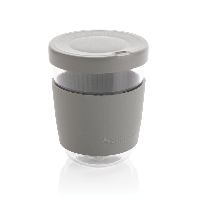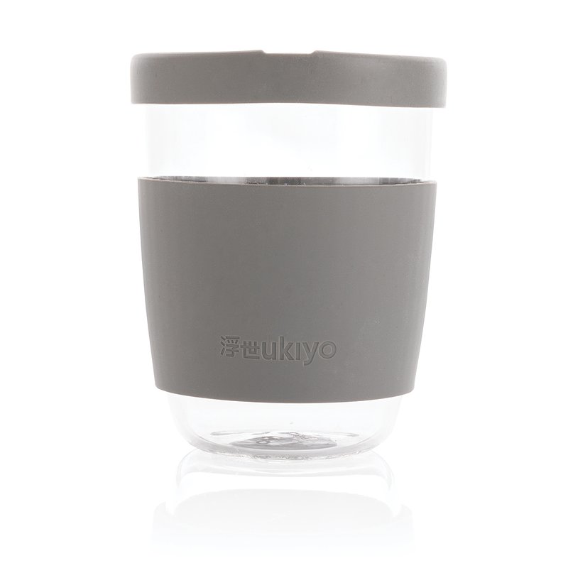 Disfruta de tu café en el trabajo o en casa en este vaso de borosilicato Ukiyo con tapa y funda de silicona. La taza tiene un buen agarre y una forma delgada. Un pequeño orificio de ventilación en la tapa permite que el vapor escape para evitar la acumulación de presión. Sin BPA. Capacidad 360ml.