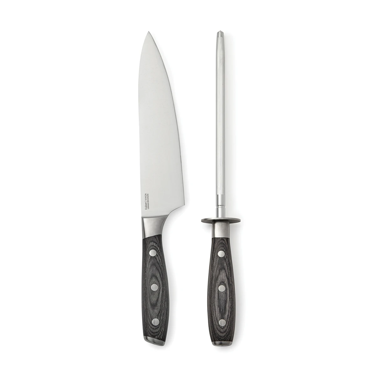 Couteau de chef et aiguiseur de la gamme Kaiser. Le couteau est fabriqué en acier allemand X50CrMoV15 et le manche est en bois de Pakka. Le manche ergonomique et l'excellent équilibre de la lame rendent le couteau confortable et facile à travailler. Les propriétés inhérentes de l'acier allemand rendent la lame résistante aux taches et ne nécessitent pas plus de soins qu'un aiguisage occasionnel. Couteau de chef : 20 cm de lame. Aiguiseur : 33 cm.