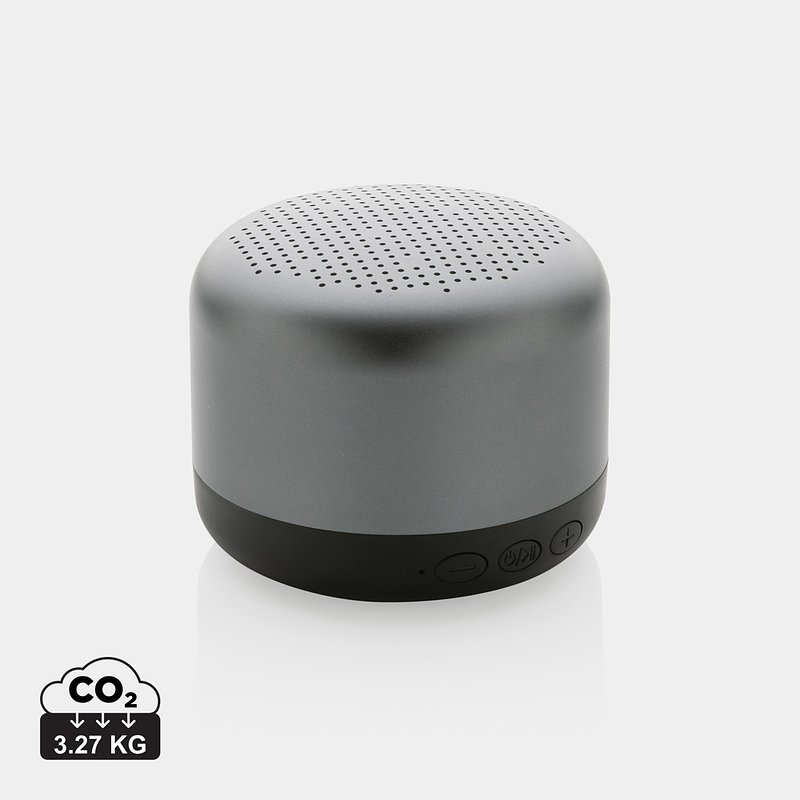 Altavoz inalámbrico de 5W fabricado con aluminio reciclado certificado RCS (Recycled Claim Standard) y ABS. Contenido reciclado total: 35% basado en el peso total del artículo. La certificación RCS garantiza una cadena de suministro completamente certificada de los materiales reciclados. El aluminio no pierde sus características en el proceso de reciclaje y puede reciclarse infinitamente. Incluye cable de carga tipo C reciclado fabricado con aluminio reciclado certificado RCS, TPE y PET. Presentado en envase mixto FSC®. La batería de 600 mah permite un tiempo de reproducción de hasta 4 horas y se puede recargar por completo en 2 horas. Con BT 5.0 para una conexión fluida hasta 10 metros.